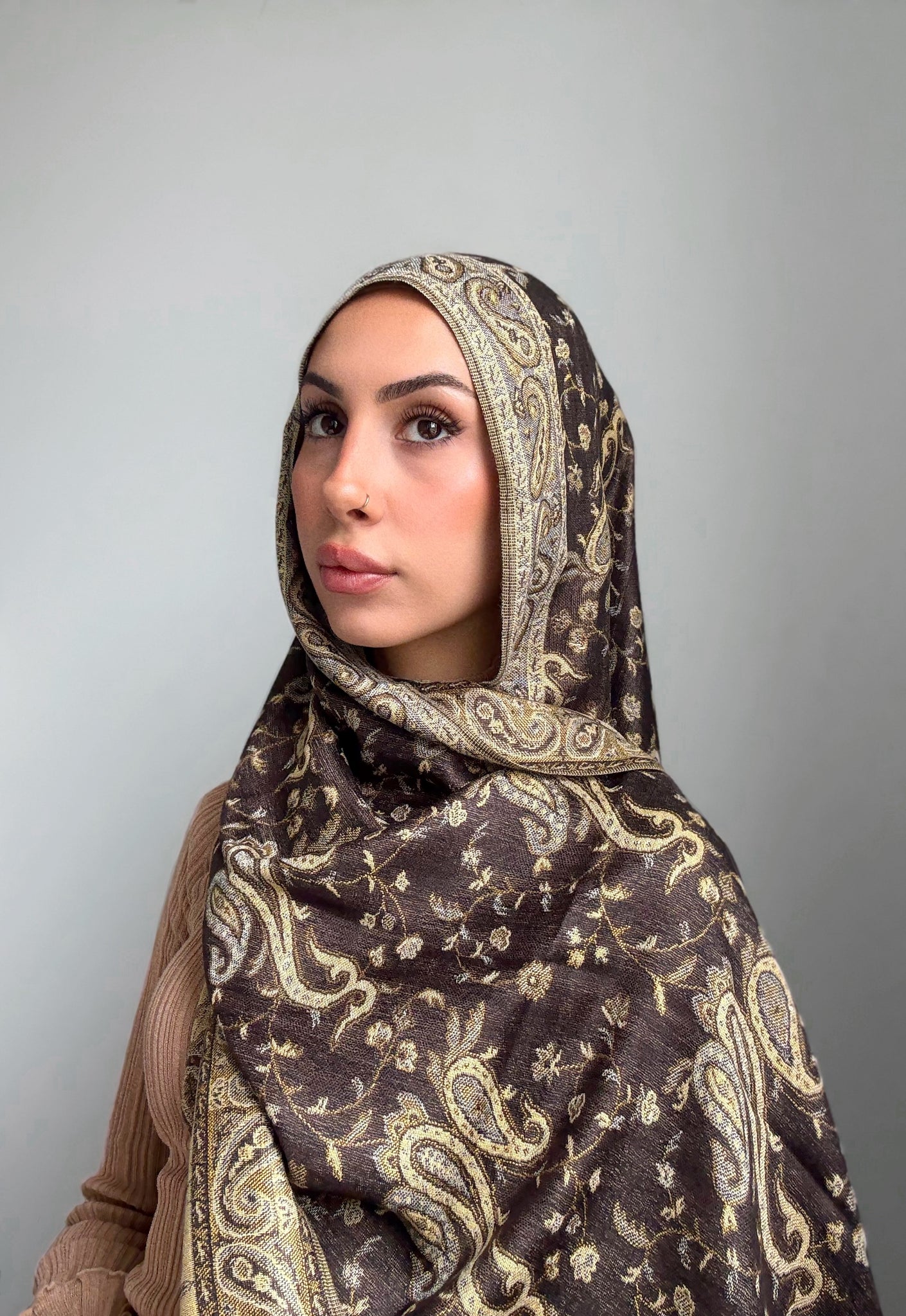 The rich, dark base creates a beautiful contrast with the soft metallic embroidery, giving the scarf a regal, timeless charm.